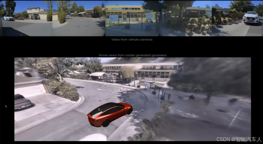 问题在于,车辆通常是线性向前行驶的,没有太多的基线。正因为如此,如果你只是拿车辆运动的相同摄像机视角,运行传统的高斯溅射,我不知道,用 NeRF Studio 或其它什么,并使用相同的摄像机视角来查看,那些接近训练视角的渲染视图看起来很棒。但是,如果你切换到远离训练视角的新视角,效果就崩溃得很厉害。