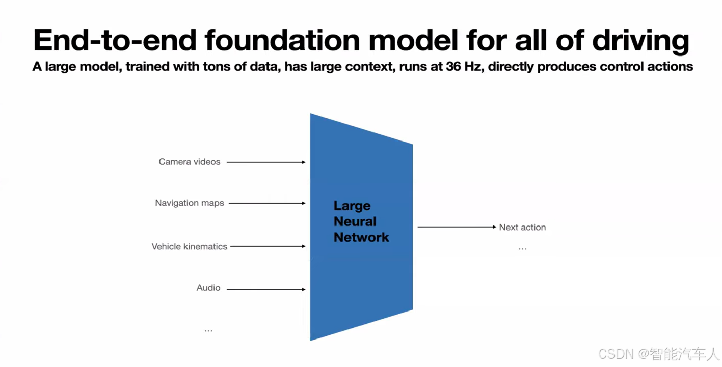 特斯拉从2023年开始使用一个单一的、大型的端到端神经网络,它可以接收像素和其他传感器数据作为输入,然后直接产生下一个动作作为输出。