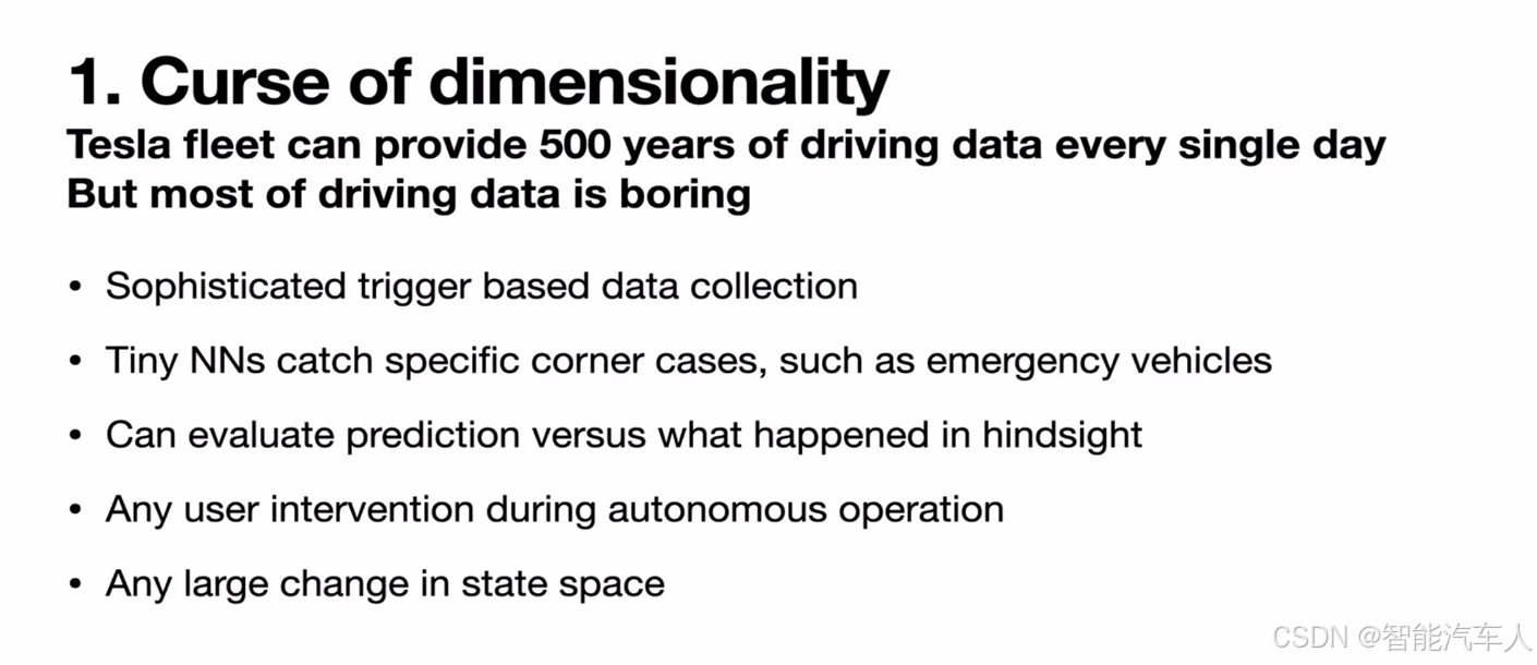 幸运的是,特斯拉在这里有一个巨大的优势,那就是特斯拉的车队非常庞大。所以它基本上拥有尼亚加拉瀑布量级的数据,特斯拉要做的就是利用这些数据来解决这个问题。你显然不希望从 20 亿个 token 到 2 个 token 之间产生伪相关性。你想要的是正确的相关性,即为什么那 2 个输出 token 必须是正确的 token。所以我们所做的,是提炼这些车队多年的驾驶数据,这些数据显然比我们集群上能存储的要多得多,提炼到必要的数据量,这些数据覆盖了驾驶的全部范围。我们有不同的方法来收集这些数据,基于特定的触发器,或针对特定场景的小型神经网络,或者像不断评估模型的预测与实际发生的情况等等。我们可以使用这样的技巧来提取我们训练所需要的、恰到好处的数据量、正确的质量和数据类型。
