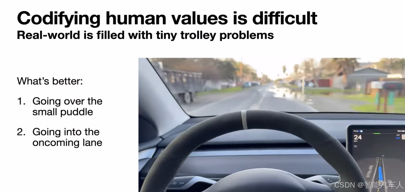 采取一个神经网络的原因,Ashok做了解释:过去采用显式的模块化方法(perception-planning等模块),因为它更容易调试等等。 但我们发现,将人类价值观这样的东西编入代码真的很难。例如,你可以为障碍物刹车,或者绕开它,你可以开得尽可能快,然后晚一点刹车,或者早一点刹车以获得更平稳的驾驶体验。这实际上归结为偏好与人类价值观的对齐,而不是存在一个客观的价值,比如刹车力度多大以及何时刹车。你也不想刹车太早,因为那样你会太慢。你也不想刹车太晚,那样会非常不舒服。并且这因情况而异,在高低速时情况非常不同。