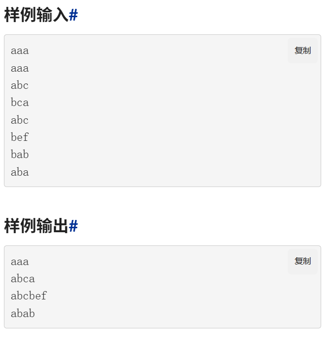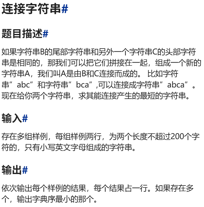 void get_ans(char s1[],char s2[],char ans[]){int len1=strlen(s1),len2=strlen(s2);int flag3=0;for(int i=0;i<len1;i++){int flag1=0,flag2=1,len=0;for(int j=i,k=0;j<len1&&k<len2;j++,k++){if(j==len1-1){flag1=1;}if(s1[j]==s2[k]){len++;}else{flag2=0;break;}}if(flag1&&flag2){strcpy(ans,s1);for(int i=len,j=0;j<len2;i++,j++){ans[len1+j]=s2[i];}flag3=1;break;}}if(flag3==0){strcpy(ans,s1);strcat(ans,s2);}