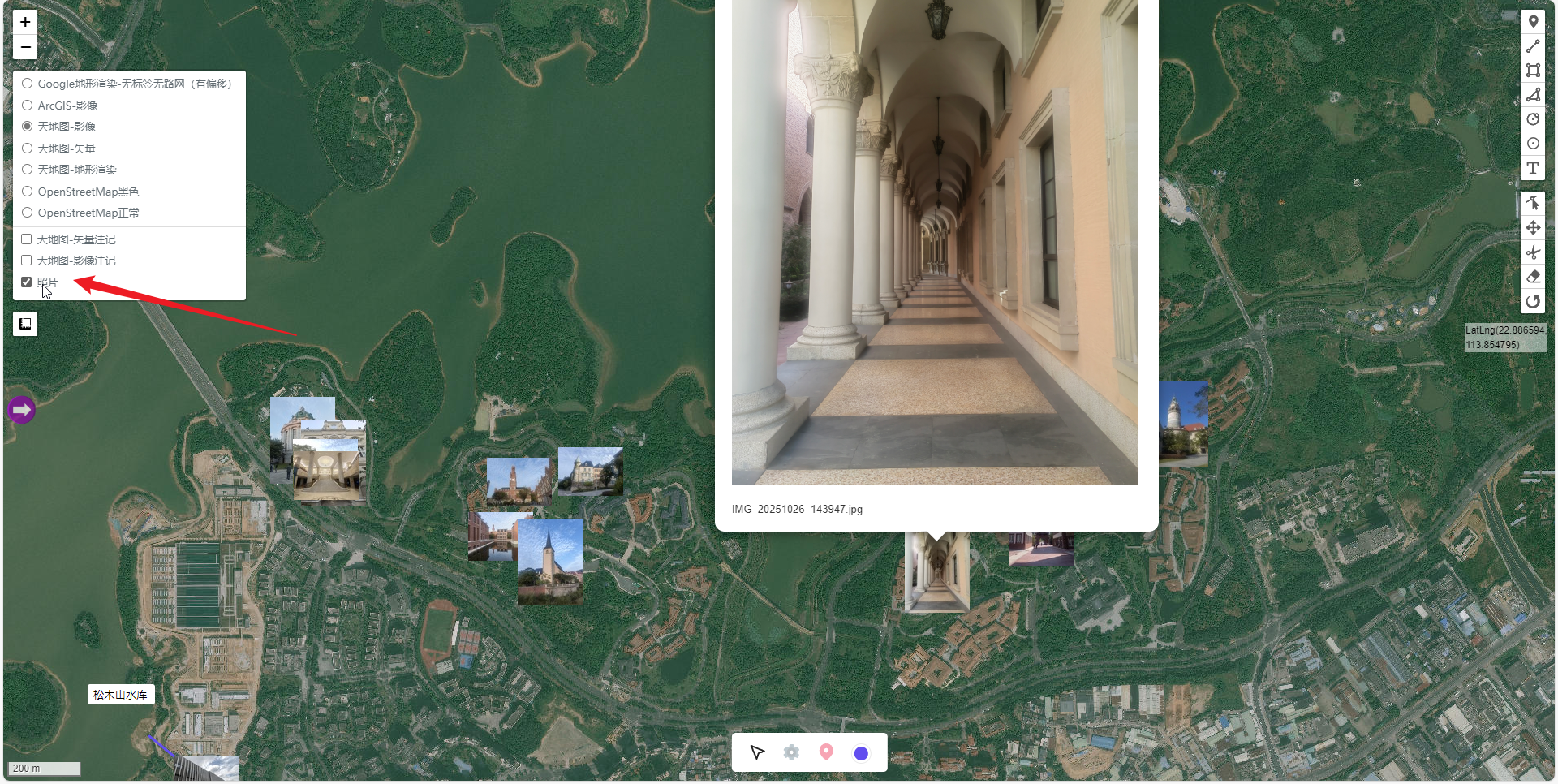 这次加了插入带gps地理信息即经纬度的照片,然后在相应的位置展示缩略图。点击缩率图弹窗查阅。