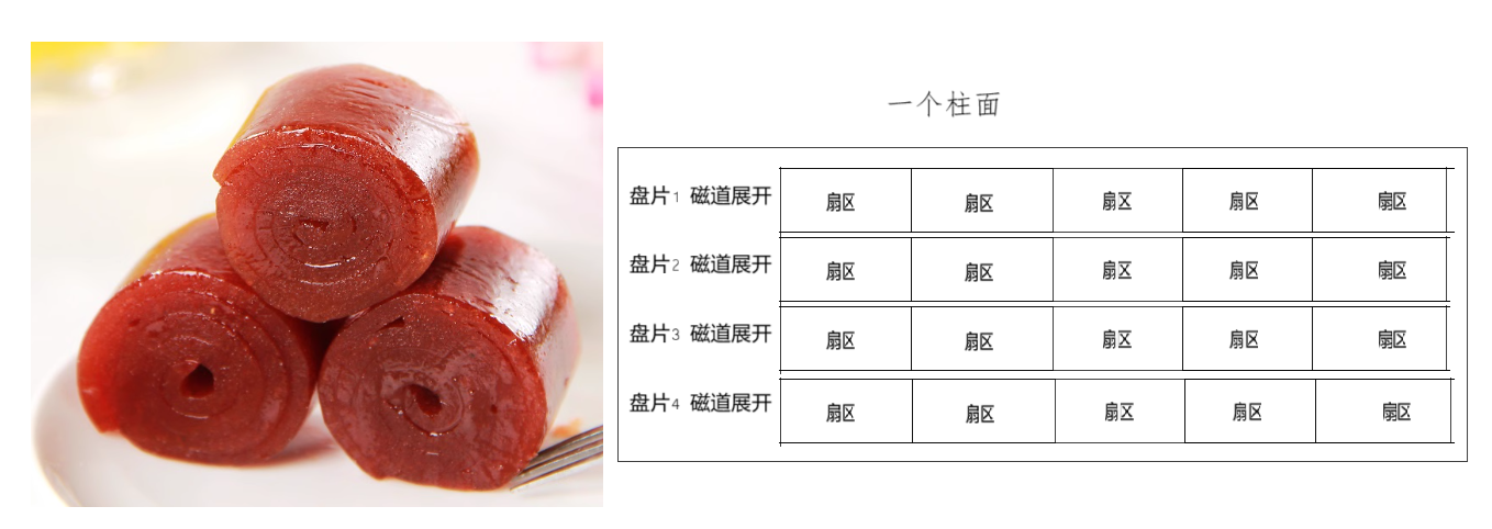 柱⾯是⼀个逻辑上的概念,其实就是每⼀⾯上,相同半径的磁道逻辑上构成柱⾯。所以,磁盘物理上分了很多⾯,但是在我们看来,逻辑上,磁盘整体是由“柱⾯”卷起来的