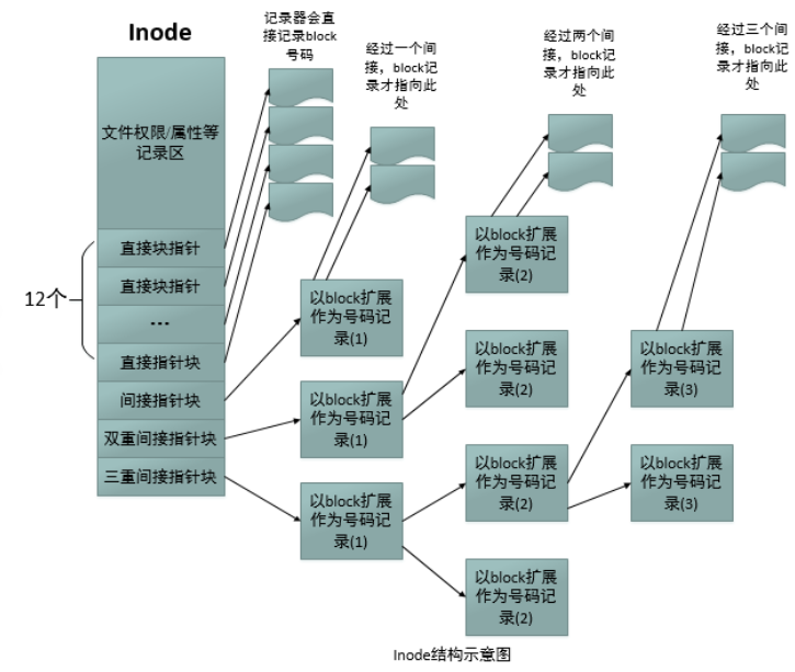 三级间接块索引指针(“查目录的目录的目录,再翻章节”):以此类推,则可以在前面的基础上多管理(1024 * 1024 * 1024 * 4KB = 4TB)4TB的文件。