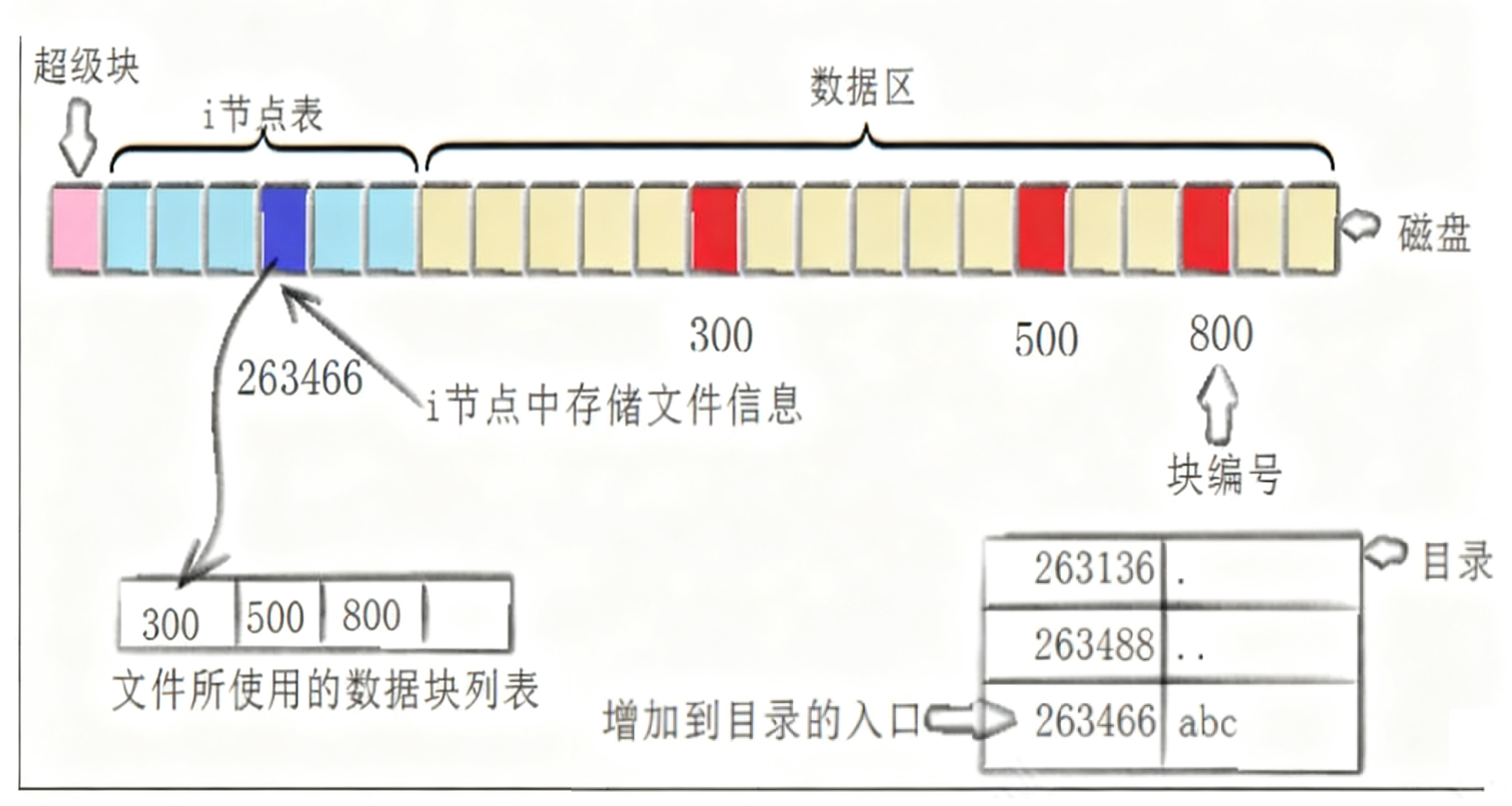 ⽂件内容按顺序300,500,800存放。内核在inode上的磁盘分布区记录了上述块列表。