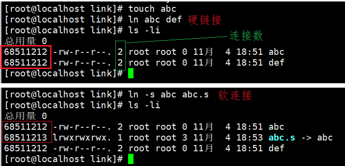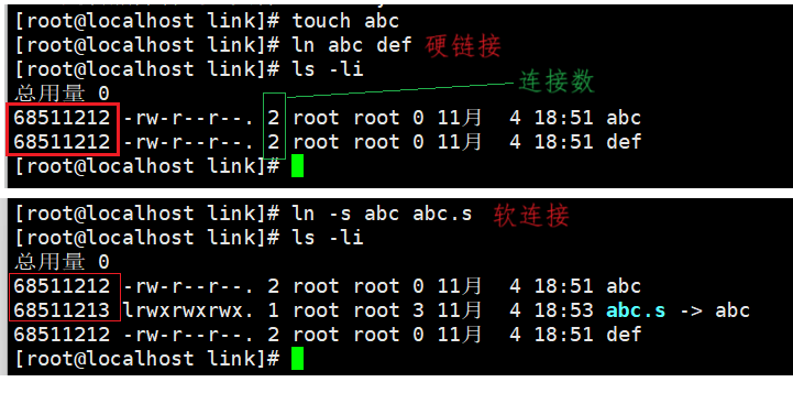 abc和def的链接状态完全相同,他们被称为指向⽂件的硬链接。内核记录了这个连接数,inode:68511212 的硬连接数为2。