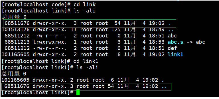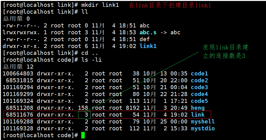 如上图我们可以发现当前目录下的 . 和下级目录下的 .. 都连接着该目录故他的连接数是3