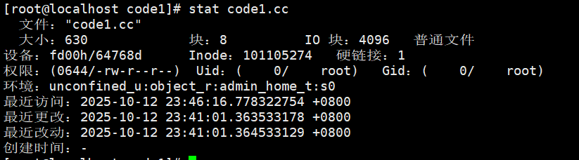 这个信息除了通过ls来读取,还有⼀个stat命令能够看到更多信息。