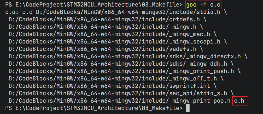 gcc -M c.c // 打印出依赖gcc -M -MF c.d c.c // 把依赖写入文件c.dgcc -c -o c.o c.c -MD -MF c.d // 编译c.c, 同事把依赖写入文件c.d3.1、打印出依赖