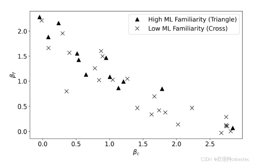 图6: 参与者线性回归系数图,标注ML熟悉度,展示策略多样性