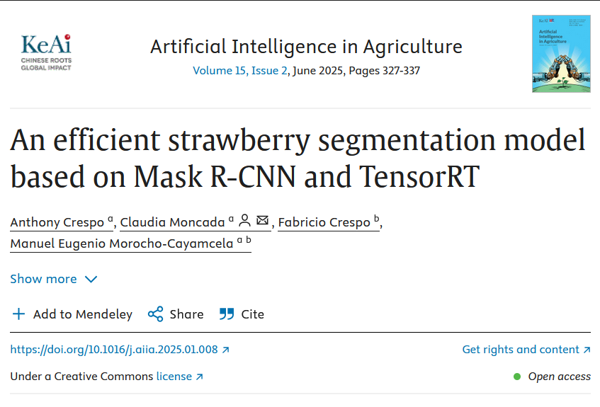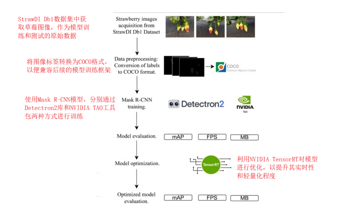 研究内容:提出高效Mask R-CNN模型用于草莓果实实例分割,用Detectron2和NVIDIA TAO两种方法训练,结合NVIDIA TensorRT优化,从FPS、模型大小、mAP值评估模型效率
