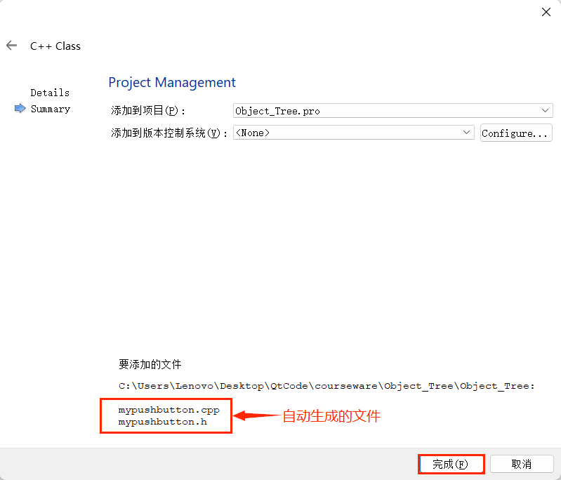 5、点击 "完成" 之后,手动创建类的头文件以及源文件会自动添加到目标程中;