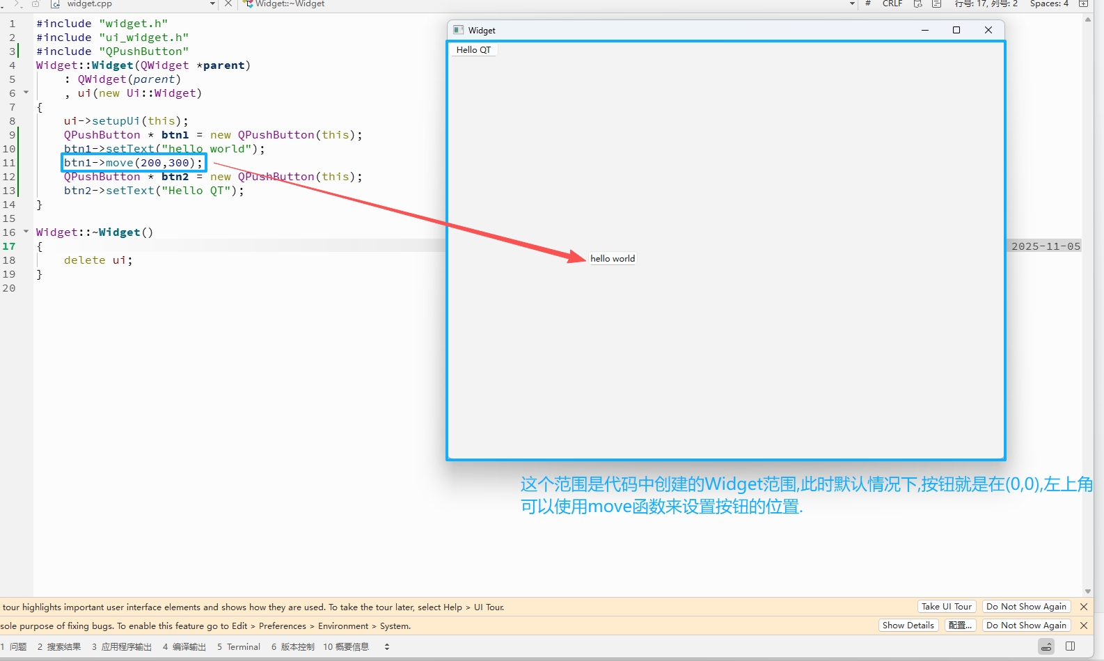 {ui->setupUi(this);QPushButton * btn1 = new QPushButton(this);btn1->setText("hello world");btn1->move(200,300);QPushButton * btn2 = new QPushButton(this);btn2->setText("Hello QT");