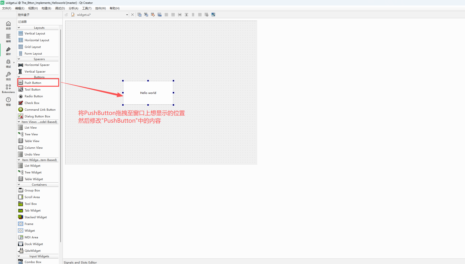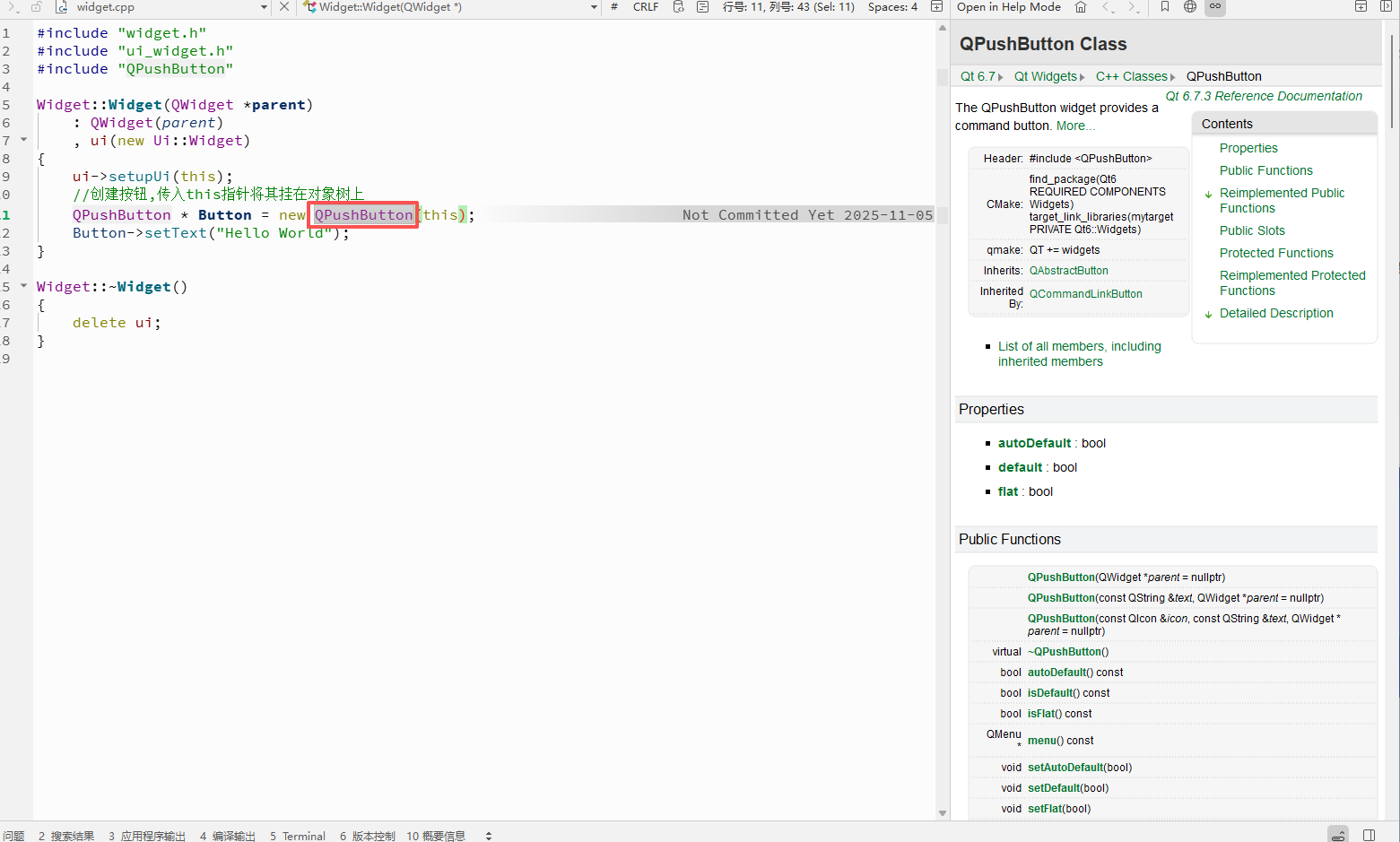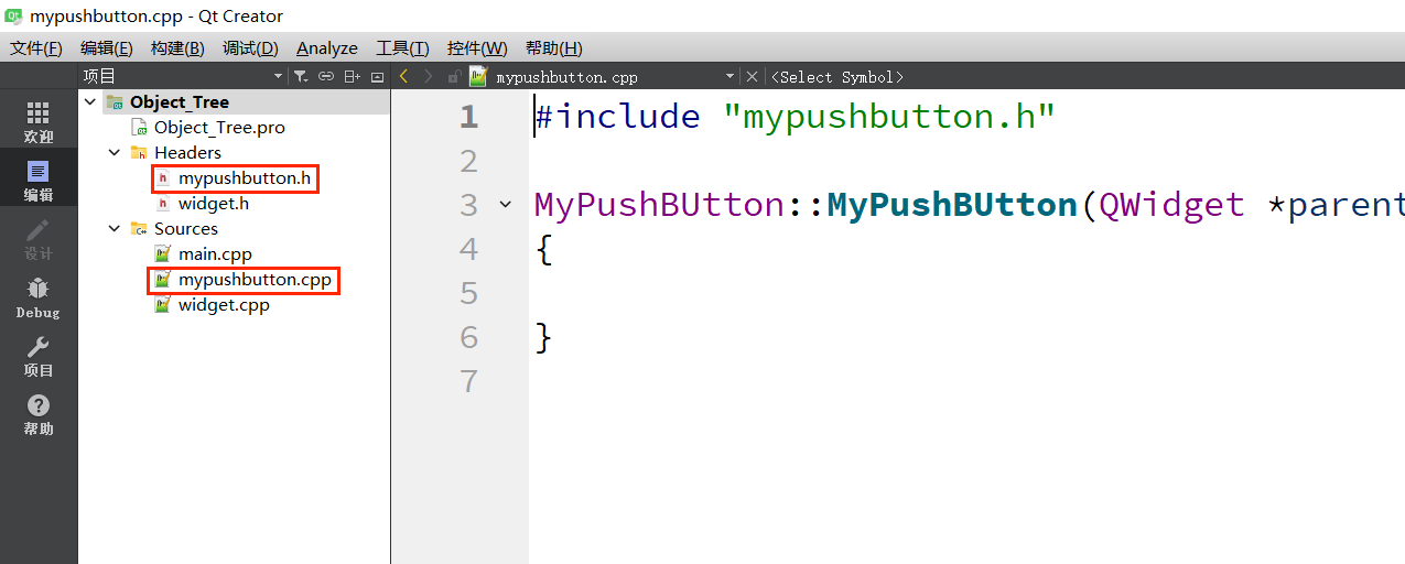 {ui->setupUi(this);//创建按钮,传入this指针将其挂在对象树上QPushButton * Button = new QPushButton(this);Button->setText("Hello World");