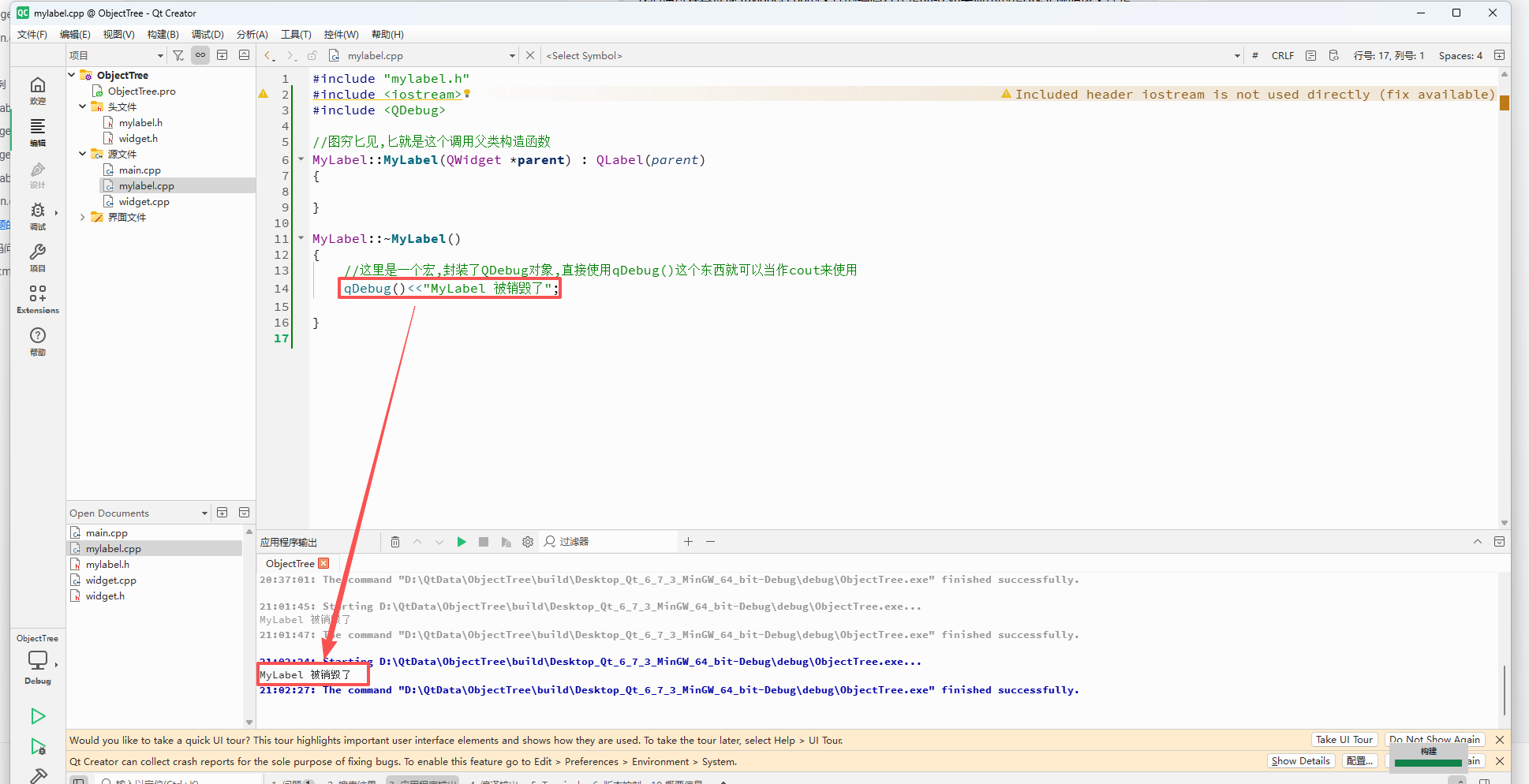 - 通过观察日志,我们可以发现,当关闭对话框时,有日志打印,说明析构函数是执行了,虽然没有手动delete,但是由于把Mylabel挂到了对象树上,此时窗口被销毁的时候,就会自动销毁对象树中的所有对象.MyLabel的析构函数是执行到了.