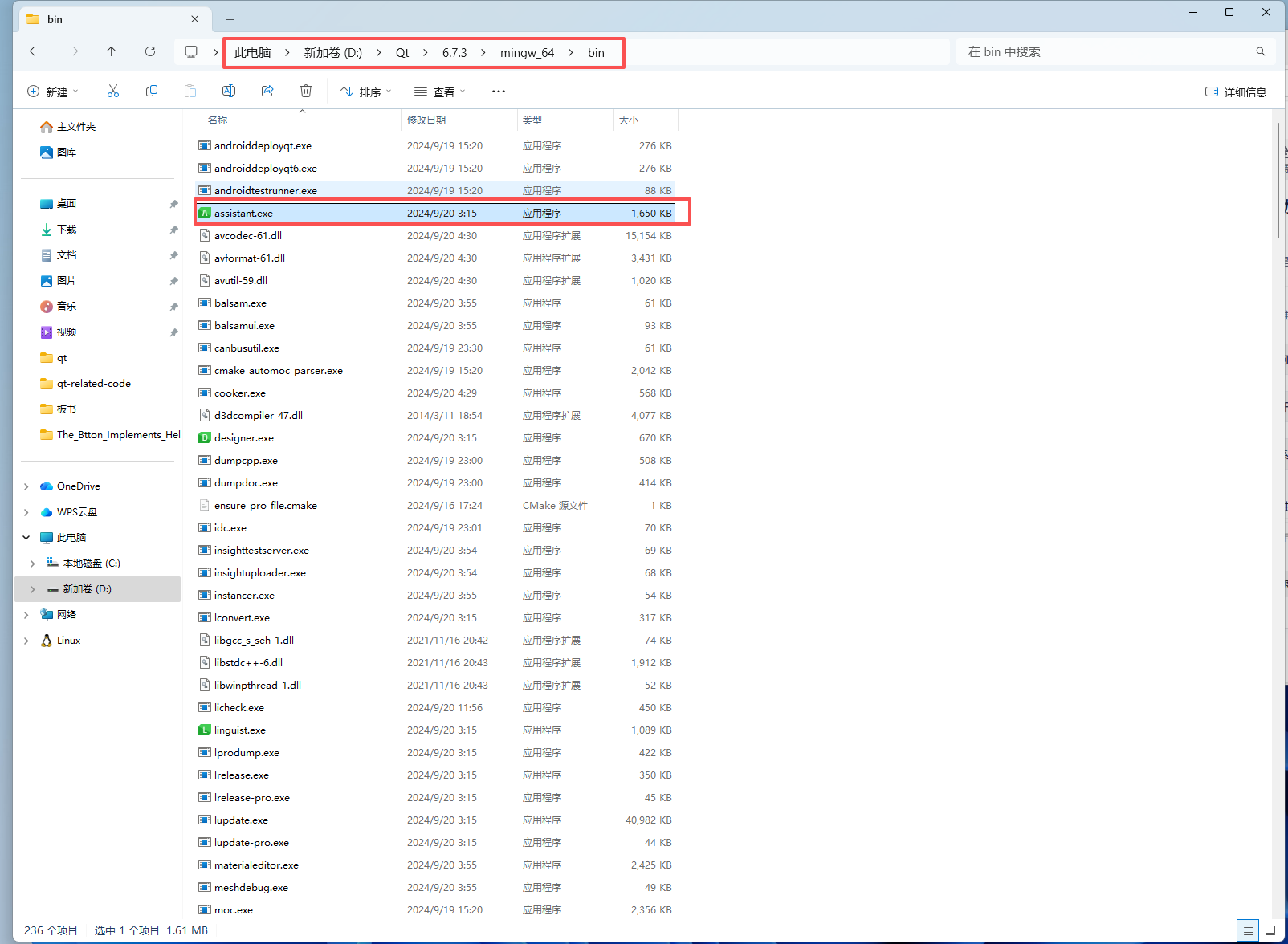 3:找到 Qt Creator 的安装路径,在 "bin" ⽂件夹下找到 assistant.exe,双击打开;