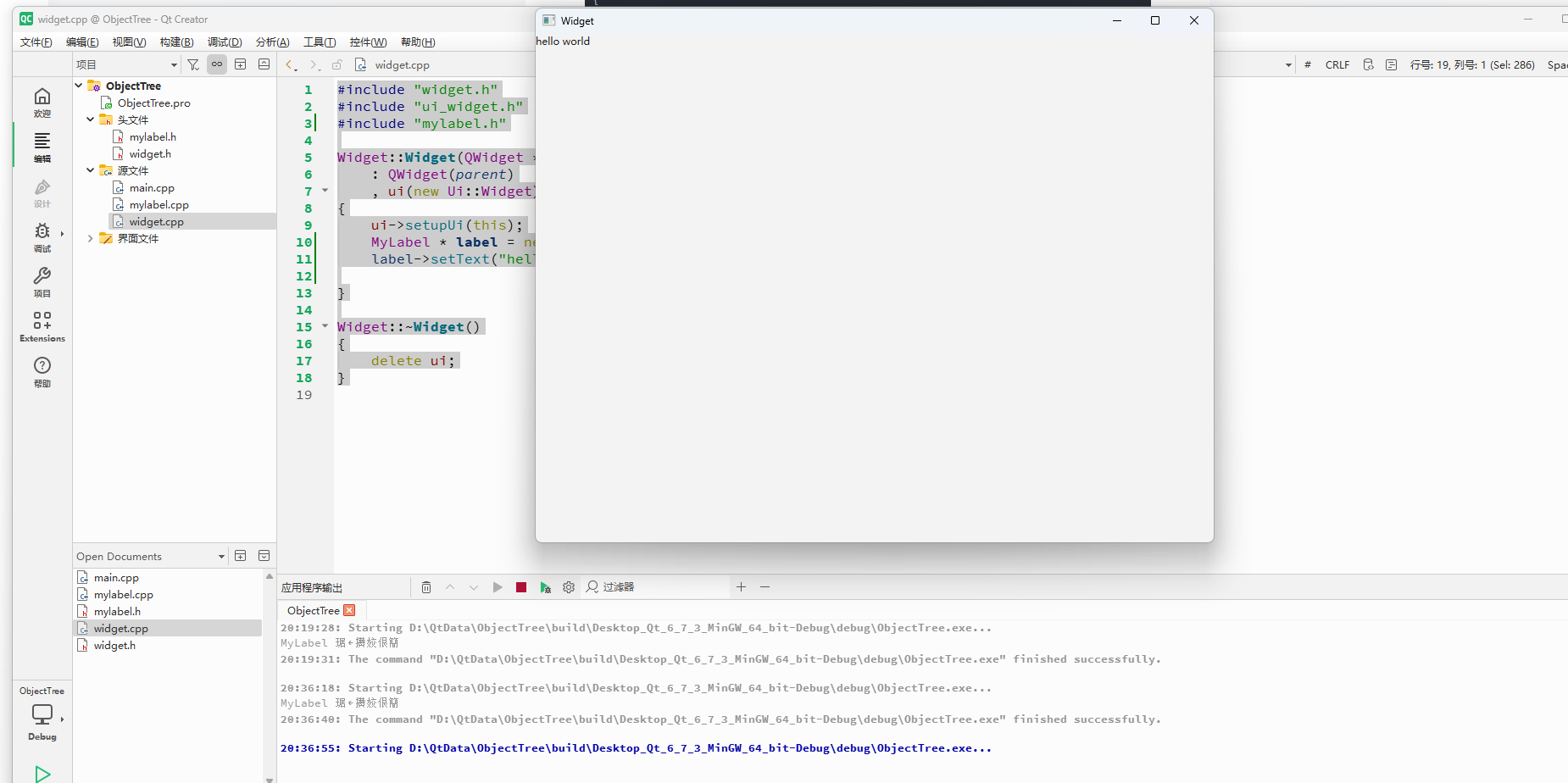 {ui->setupUi(this);MyLabel * label = new MyLabel(this);label->setText("hello world");}Widget::~Widget()