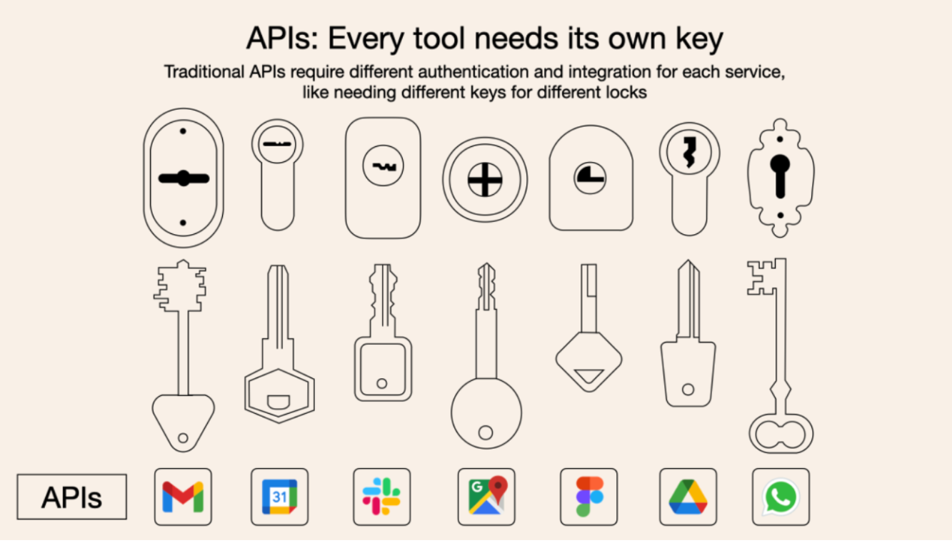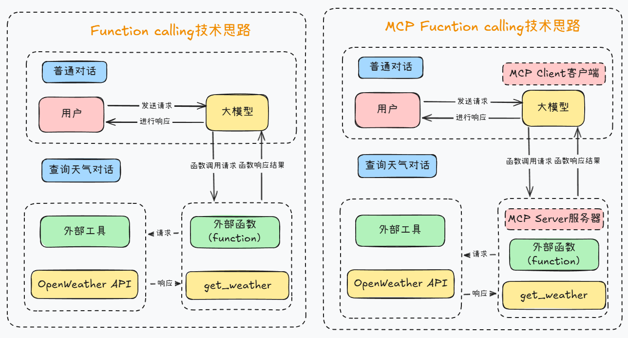 MCP协议本质就是Function calling技术的更高层封装和实现。传统的Function calling技术要求围绕不同的外部工具API单独创建一个外部函数,类似一把锁单独配一把钥匙,而一个智能体又往往涉及到多个外部工具设计,因此开发工作量很大。