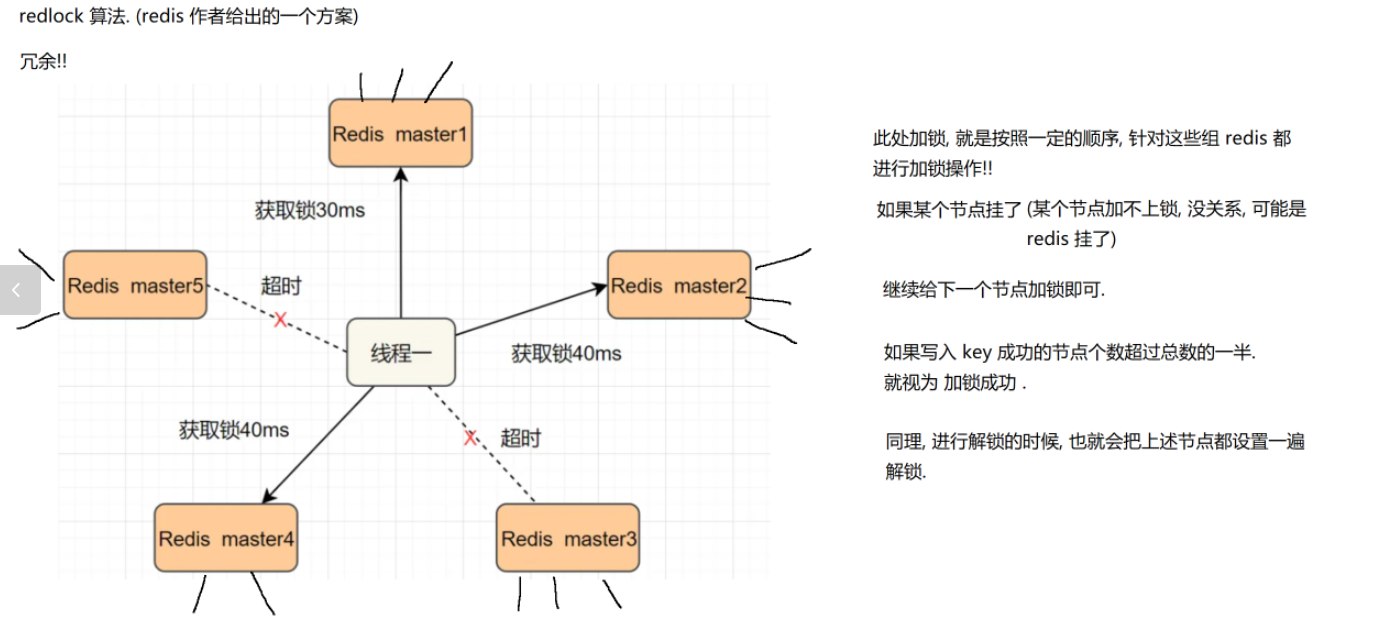 引⼊⼀组 Redis 节点. 其中每⼀组 Redis 节点都包含⼀个主节点和若⼲从节点. 并且组和组之间存 储的数据都是⼀致的, 相互之间是 "备份" 关系(⽽并⾮是数据集合的⼀部分, 这点有别于 Redis cluster). 加锁的时候, 按照⼀定的顺序, 写多个 master 节点. 在写锁的时候需要设定操作的 "超时时间". ⽐如 50ms. 即如果 setnx 操作超过了 50ms 还没有成功, 就视为加锁失败.