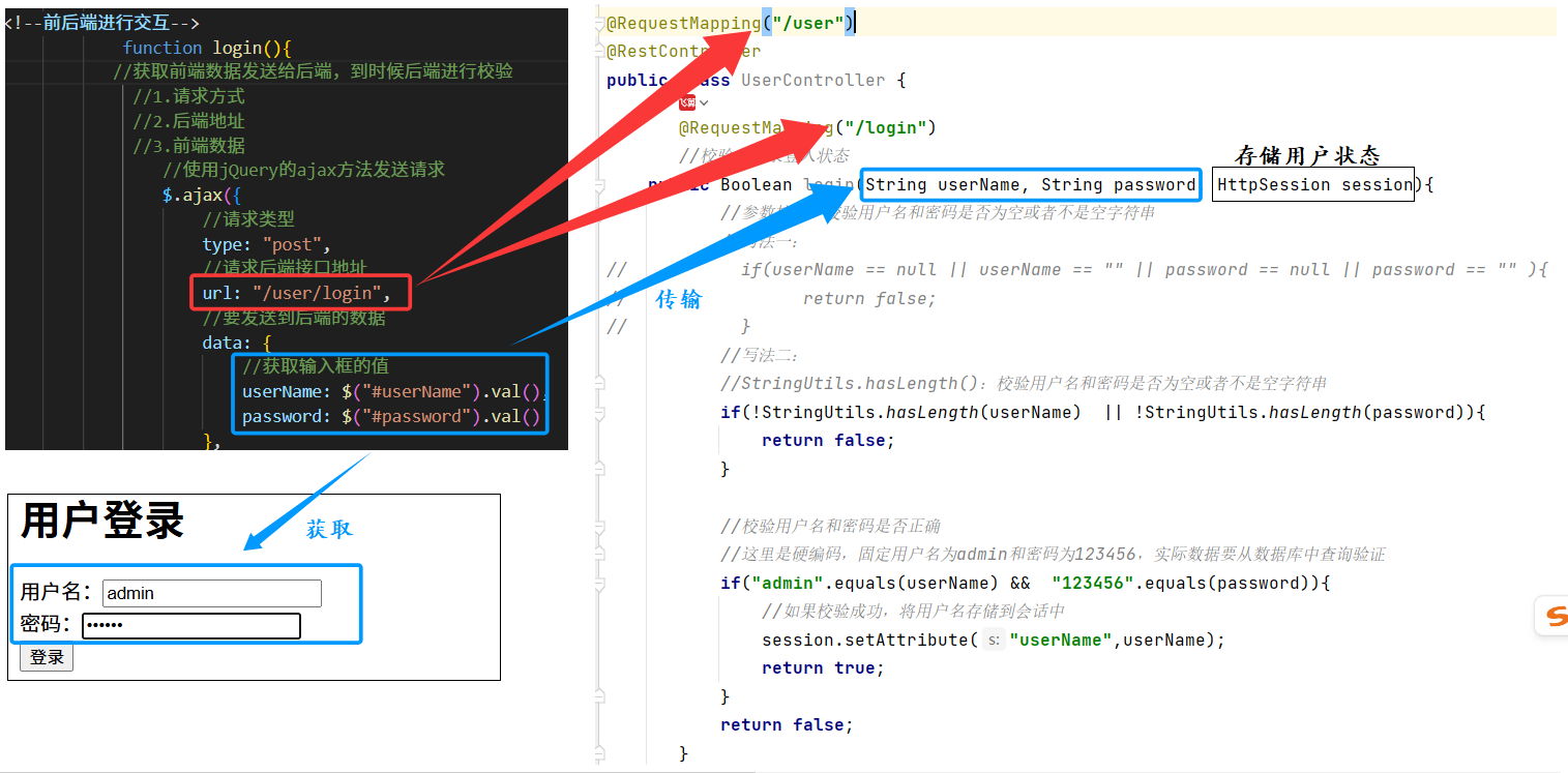 <!--前后端进行交互-->function login(){//获取前端数据发送给后端,到时候后端进行校验//1.请求方式//2.后端地址//3.前端数据//使用jQuery的ajax方法发送请求$.ajax({//请求类型type: "post",//请求后端接口地址url: "/user/login",//要发送到后端的数据data: {//获取输入框的值userName: $("#userName").val(),password: $("#password").val()},//返回后端校验后的结果//成功跳转页面//失败,进行错误提示//http请求成功的回调函数//success:是ajax专门为成功响应设计的回调,会自动接收后端返回的正常结果success: function(result){//判断后端返回的结果if(result){//如果登入成功,跳转页面location.href="index2.html";}else{//否则,返回错误提示alert("密码错误");}}})}</script>