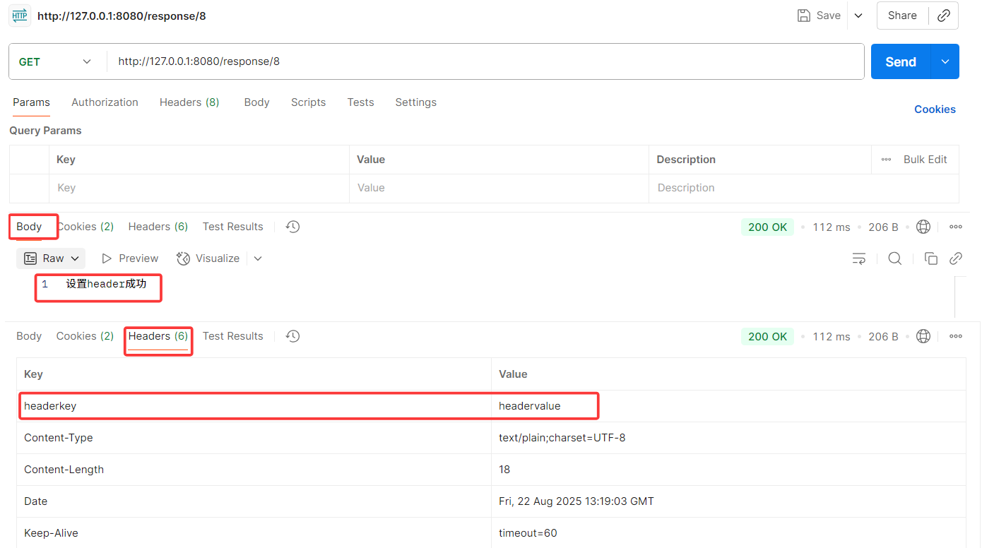 @RequestMapping("/8")@ResponseBodypublic String method8(HttpServletResponse response){response.setHeader("headerkey","headervalue");return "设置header成功";}