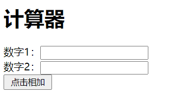 <body><form action="calc/sum" method="post"><h1>计算器</h1>数字1:<input name="num1" type="text"><br>数字2:<input name="num2" type="text"><br><input type="submit" value=" 点击相加 "></form>