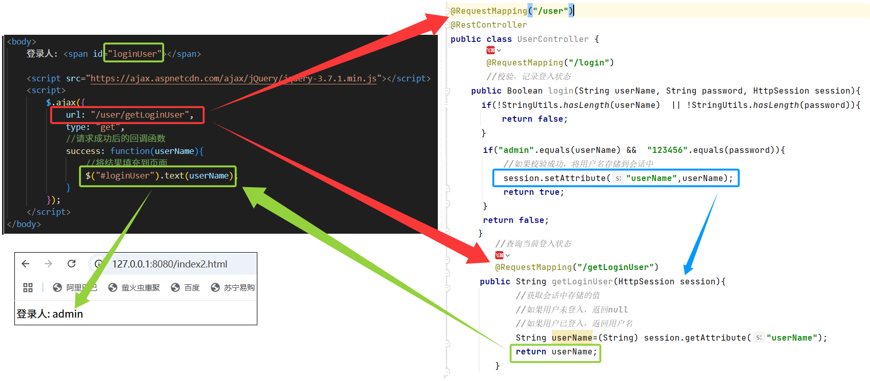 </head><body>登录人: <span id="loginUser"></span><script src="https://ajax.aspnetcdn.com/ajax/jQuery/jquery-3.7.1.min.js"></script><script>$.ajax({url: "/user/getLoginUser",type: "get",//请求成功后的回调函数success: function(userName){//将结果填充到页面$("#loginUser").text(userName);}});</script>