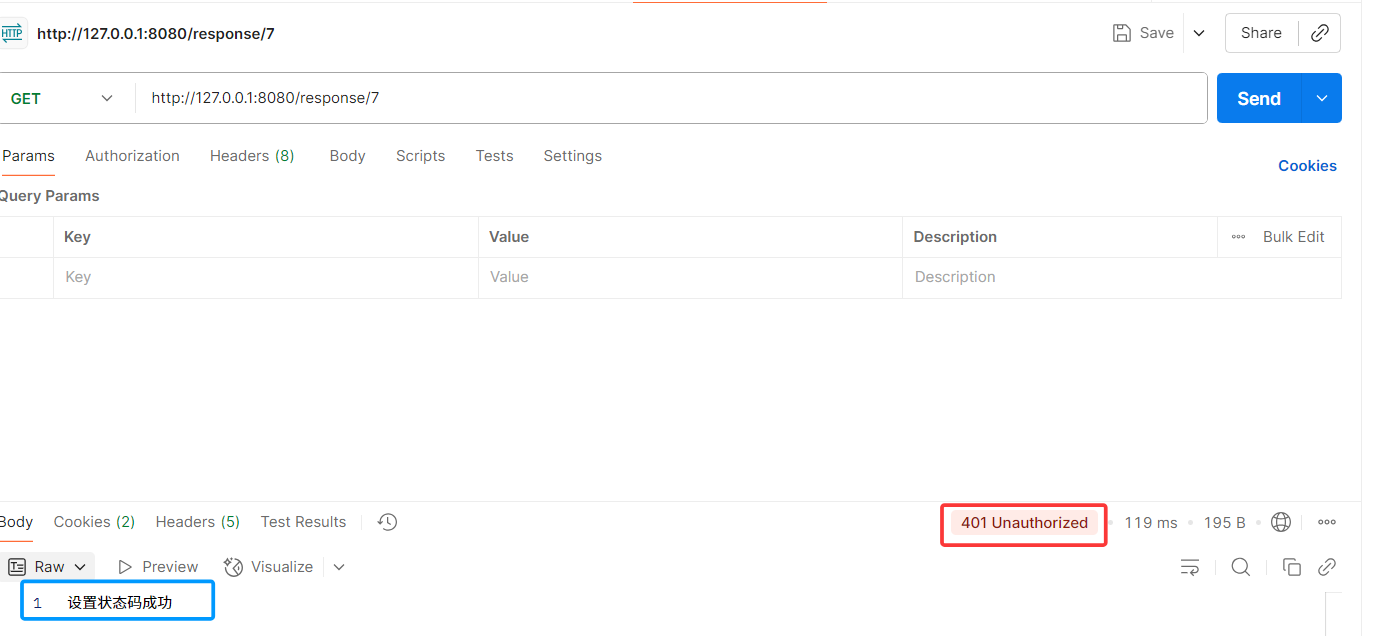 @RequestMapping("/7")@ResponseBodypublic String method7(HttpServletResponse response){response.setStatus(401);return "设置状态码成功";}