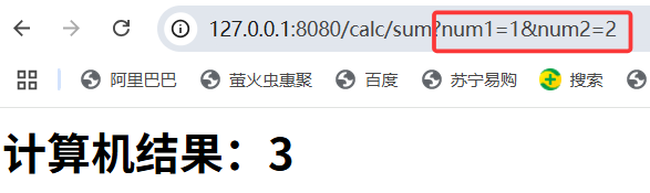 public class CalcController {@RequestMapping("/sum")public String method8(Integer num1,Integer num2){//如果有其中一个没有参数,直接返回if(num1 == null || num2 ==null){return "参数不合法";}Integer sum=num1+num2;return "<h1>计算机结果:" + sum + "<h1>";}