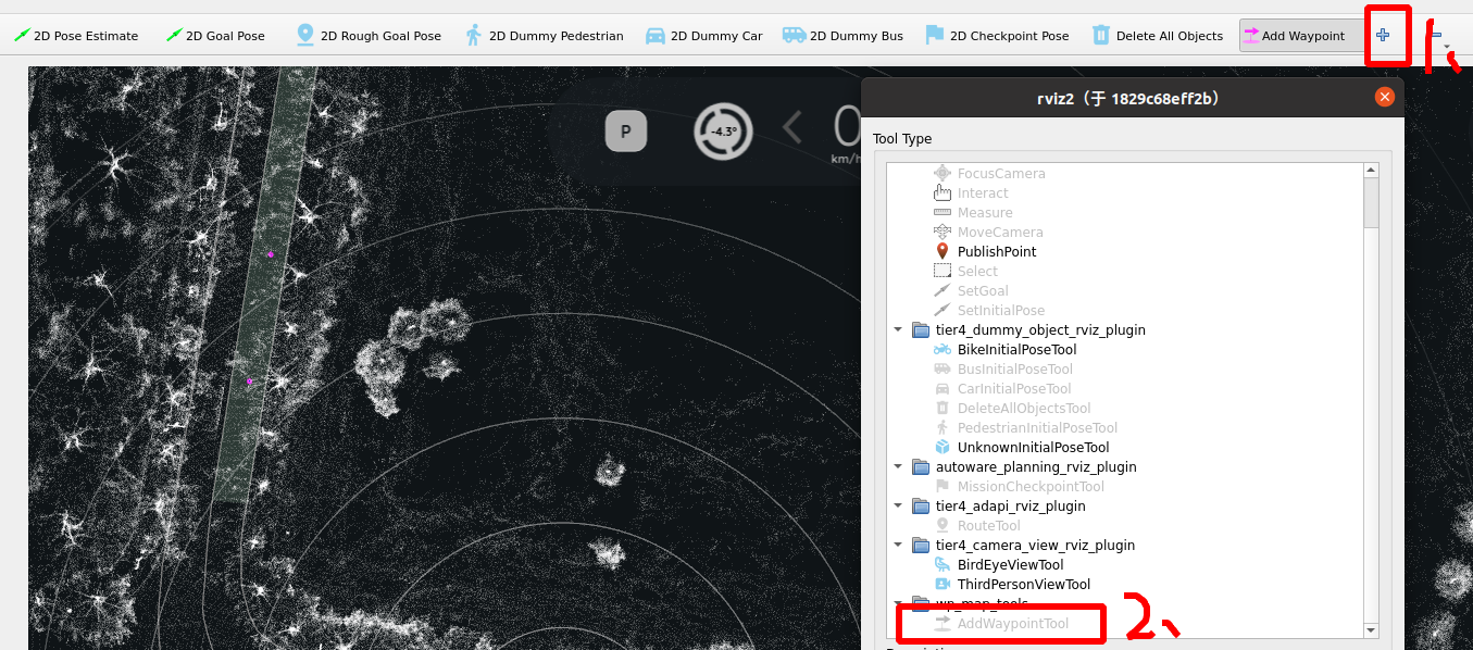 autoware topic/planning/mission_planning/goaltype: geometry_msgs::msg::PoseStamped功能:发送目标点消息/planning/mission_planning/statetype: tier4_planning_msgs::msg::RouteState功能:返回autoware路由状态,state字段为4代表可路由,为6代表已经到达目标点/autoware/engagetype: autoware_vehicle_msgs::msg::Engage功能:启动车辆自动驾驶功能wp_map_tools topic/waterplus/add_waypointtype: wp_map_tools::msg::Waypoint功能 接受设置的目标航点(支持多个)