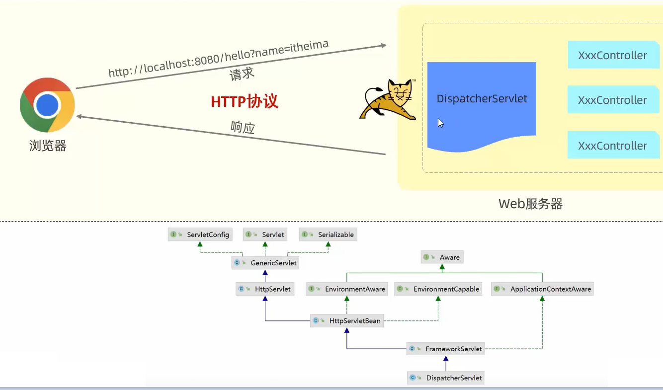 web.xml,DispatcherServlet会自动注册(默认路径为/)。 - 所有进入应用的 HTTP 请求(除静态资源等被排除的)都会经过它。