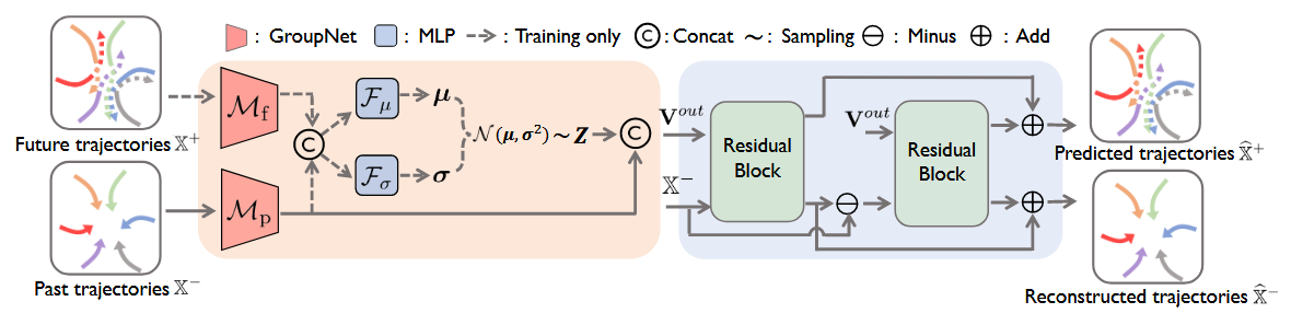 首先将过去轨迹X-和未来轨迹X+分别输入给GroupNet,得到智能体未来和过去的embedding——V+和V-