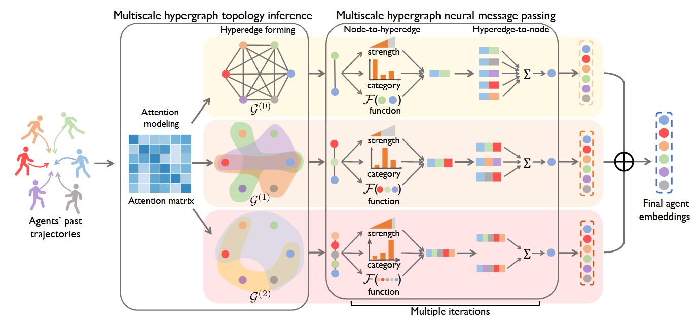 过去的工作只考虑了有限关系推理的成对交互,因此提出了GroupNet,可以通过可训练的多尺度超图,用于对具有多个不同大小的群体交互进行建模,以数据驱动的方式学习这种多尺度超图拓扑,来提取更全面更群体化的交互;在学习时,为了学习交互embedding,提出三要素格式:神经交互强度、神经交互类别和每个类别函数