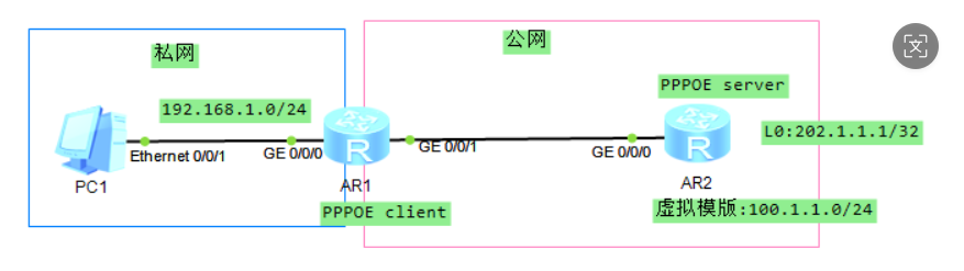 1、如图,私网内部配置为 192.168.1.0/24 网段,R2 上配置 Loopback0 口模拟互联网地址