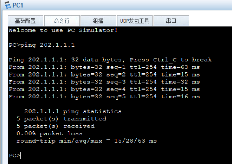 在 R1 上检查,发现已经拨号成功,并获得了公网 IP 地址,PC1 也可以访问互联网