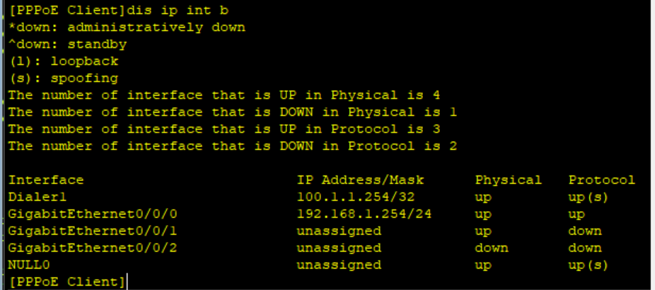 [PPPoE Client-GigabitEthernet0/0/0]ip add 192.168.1.254 24