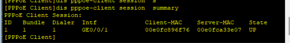 [PPPoE Client-GigabitEthernet0/0/1]pppoe-client dial-bundle-number 1 //指定PPPoE会话所对应的Dialer bundle