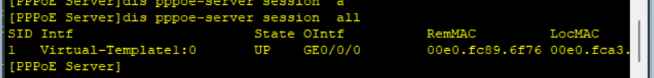 [PPPoE Server-GigabitEthernet0/0/0]pppoe-server bind virtual-template 1