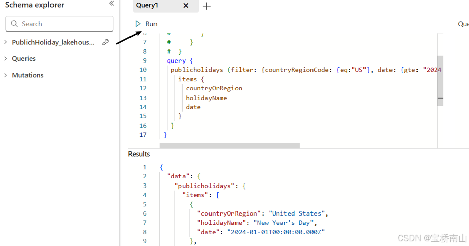 6) 在出来的GraphQL API界面中,可以输入一个query,然后点击Run,将得到一些数据