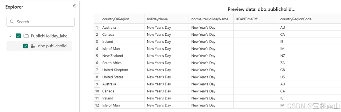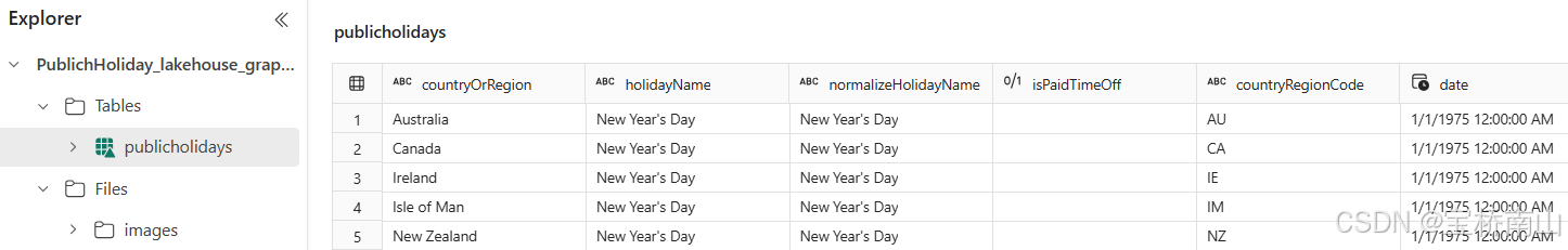 则对应的Lakehouse中Holiday table中将被展现出来了