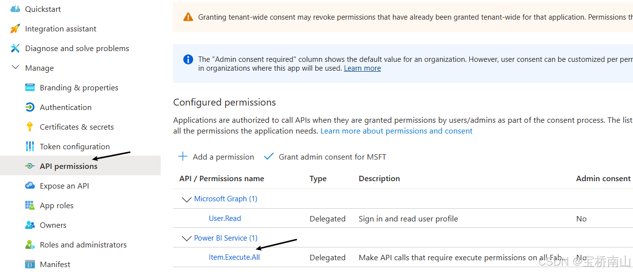 2) 配置一下 API permission如下,需要的权限是Item.Execute.All