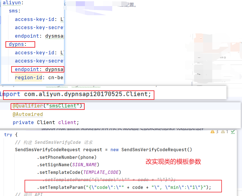 然后阿里云的号码控制台的 配置 代码修改 如下