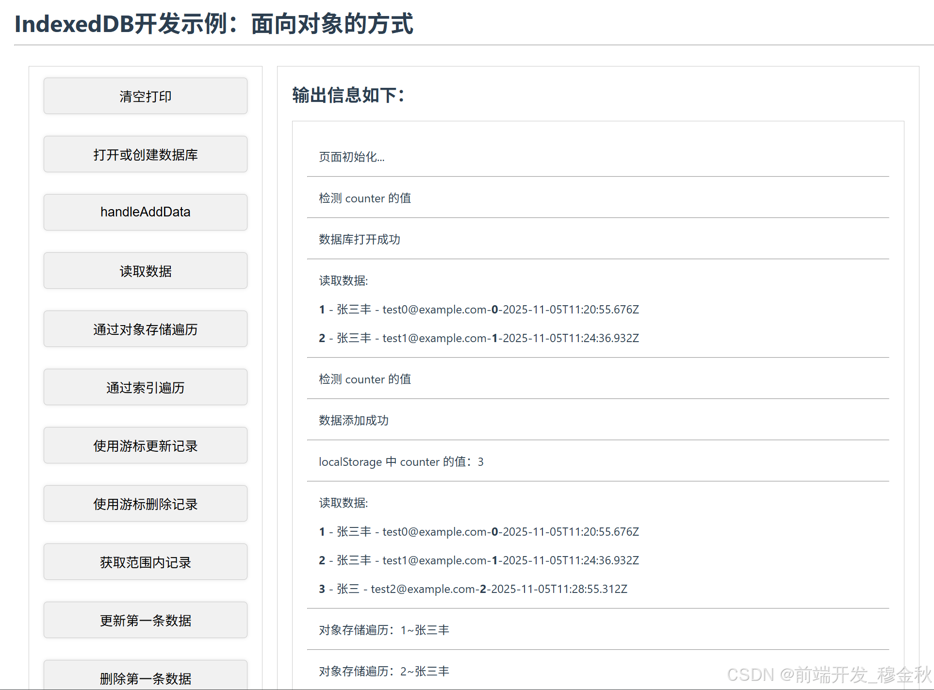 <html lang="zh-CN"><head><meta charset="utf-8" /><meta name="viewport" content="width=device-width, initial-scale=1.0" /><title>木木的学习笔记</title><link rel="stylesheet" href="./css/common.css" /><style>div.flexBox {min-height: 100%;width: 100%;box-sizing: border-box;padding: 20px;display: flex;flex-direction: row;justify-content: start;/* border: 1px solid #ccc; */div.left {border: 1px solid #ccc;display: flex;flex-direction: column;justify-content: start;button {display: block;min-width: 280px;height: 50px;background-color: #f1f1f1;border: 1px solid #ccc;cursor: pointer;font-size: 18px;margin: 15px 20px;padding: 5px 20px;border-radius: 5px;box-shadow: 0 0 5px rgba(0, 0, 0, 0.1);transition: all 0.2s ease-in-out;outline: none;}}div.right {margin-left: 20px;padding: 20px;border: 1px solid #ccc;div#output {min-width: 800px;margin-top: 20px;border: 1px solid #ccc;padding: 20px;div {margin: 1rem; /* 1rem = 16px */}}}}</style></head><body><div class="container"><h1>IndexedDB开发示例:面向对象的方式</h1><hr /><div class="flexBox"><div class="left"><!-- 一些方法返回 Promise,但 HTML 中的调用没有处理 async/await。虽然这不会导致错误,但如果需要等待操作完成,应该考虑使用 async/await。 --><!-- HTML 中直接调用 async 方法时没有使用 await,这在某些场景下可能不是期望的行为。 --><button onclick="app.clearWrite()">清空打印</button><button onclick="app.openDB()">打开或创建数据库</button><button onclick="app.handleAddData()">handleAddData</button><button onclick="app.readData()">读取数据</button><button onclick="app.storeOpenCursor()">通过对象存储遍历</button><button onclick="app.indexOpenCursor()">通过索引遍历</button><button onclick="app.updateRecord()">使用游标更新记录</button><button onclick="app.deleteRecord()">使用游标删除记录</button><button onclick="app.getDataByKeyRange()">获取范围内记录</button><button onclick="app.updateData()">更新第一条数据</button><button onclick="app.deleteData()">删除第一条数据</button><button onclick="app.handleOpenKeyCursor()">handleOpenKeyCursor</button><button onclick="app.handleDeleteDatabase()">handleDeleteDatabase</button><button onclick="app.clearData()">清空所有数据</button><!-- 问题:async 方法在 HTML 中调用没有处理 Promise --><!-- 建议改为: --><!-- app.openDB() 确实返回一个 Promise,这部分是正确的 --><!-- <button onclick="app.openDB().catch(console.error)">打开或创建数据库</button> --><!-- Uncaught TypeError: Cannot read properties of undefined (reading 'catch') at HTMLButtonElement.onclick --><!-- app.handleAddData() 不返回 Promise,它是一个普通的异步函数,没有显式返回 Promise --><!-- <button onclick="app.handleAddData().catch(console.error)">添加数据</button> --><!-- 问题:async 方法调用没有错误处理 --><!-- 方案1:添加全局错误处理 --><button onclick="app.handleAddDataByPromise().catch(handleError)">handleAddDataByPromise</button><!-- 方案2:修改所有方法返回 Promise --><button onclick="app.safeCall('handleAddData')">safeCall("handleAddData")</button><!-- 虽然 safeCall 方法可以处理 Promise,但直接调用 handleAddDataByPromise 更简单。 --><button onclick="app.handleAddDataByPromise()">handleAddDataByPromise</button></div><div class="right"><h2>输出信息如下:</h2><div id="output"></div></div></div></div><script>// 在类外部添加全局错误处理function handleError(error) {console.error("操作失败:", error.message);}// IndexedDB 操作类class IndexedDBManager {constructor(dbName = "MyTestDB", version = 1) {this.dbName = dbName;this.version = version;this.db = null; //数据库对象this.counter = 0; //counter 用于生成唯一的不重复的值this.init();}// 初始化init() {this.showOutput("页面初始化...");this.checkCounter();}// 添加安全调用方法// 统一方法实现,选择让所有方法返回 Promise 或使用 safeCallasync safeCall(methodName, ...args) {try {return await this[methodName](...args);} catch (error) {this.showOutput(`操作 ${methodName} 失败`);throw error;}}checkCounter() {this.showOutput("检测 counter 的值");// 从 localStorage 获取计数器值,如果不存在则默认为 0if (!localStorage.getItem("counter")) {localStorage.setItem("counter", "0");this.counter = 0;} else {// counter 变量会是字符串类型(如果没有经过 parseInt 转换),这可能导致后续的数学运算出现问题。// 添加默认值处理this.counter = parseInt(localStorage.getItem("counter")) || 0;}}// 重置计数器resetCounter() {this.counter = 0;localStorage.removeItem("counter"); // 删除localStorage中的counter}// 显示输出showOutput(msg) {document.getElementById("output").innerHTML += "<div>" + msg + "</div><hr/>";}// 清空输出clearWrite() {document.getElementById("output").innerHTML = "";}// 打开数据库(返回 Promise)openDB() {// 如果已经有打开的数据库,直接返回 resolved Promiseif (this.db) {this.showOutput("数据库已打开");return Promise.resolve(this.db);}return new Promise((resolve, reject) => {const request = indexedDB.open(this.dbName, this.version);request.onsuccess = (e) => {this.db = e.target.result;// 版本变更事件处理this.db.onversionchange = () => {// deleteDatabase() 删除数据库时也会触发this.db.close();this.showOutput("触发 onversionchange,数据库已关闭");};this.showOutput("数据库打开成功");resolve(this.db);};request.onerror = (e) => {this.showOutput("数据库打开失败");reject(e.target.error);};// 升级数据库request.onupgradeneeded = (e) => {this.showOutput("触发 onupgradeneeded :数据库升级");this.db = e.target.result;const transaction = e.target.transaction;let oldVersion = e.oldVersion;let newVersion = e.newVersion || this.db.version; // 兼容性处理this.showOutput(`数据库版本从 ${oldVersion} 升级到 ${newVersion}`);// 安全的迁移方式const migrateToVersion 