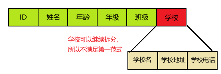 下面的表不满足第一范式:学校是⼀个对象,可以继续进⾏拆分,所以不满⾜第⼀范式