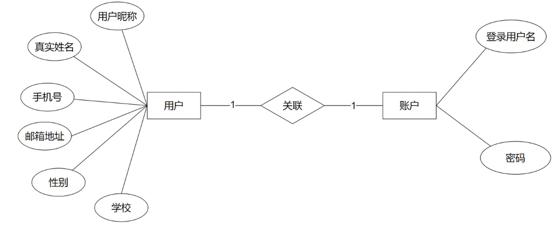 - 用户实体与账户实体是⼀对⼀的关系,⽤E-R图表示如下: