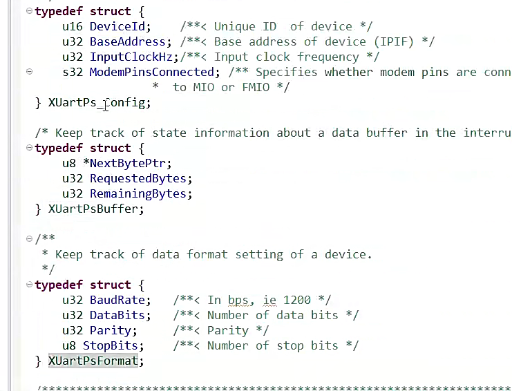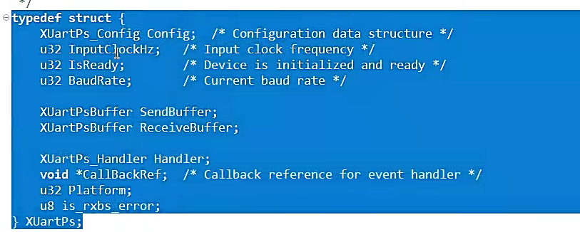这里面是uartps端的参数,其中有uart控制器结构体以及 UART配置寄存器结构体以及buffer。
