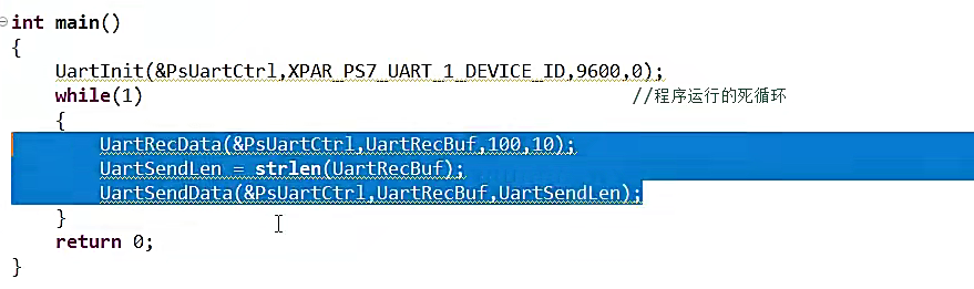{UartInit(&PsUartCtrl,XPAR_PS7_UART_1_DEVICE_ID,9600,0);while(1) //程序运行的死循环{UartRecData(&PsUartCtrl,UartRecBuf,100,10);UartSendLen = strlen(UartRecBuf);UartSendData(&PsUartCtrl,UartRecBuf,UartSendLen);}return 0;