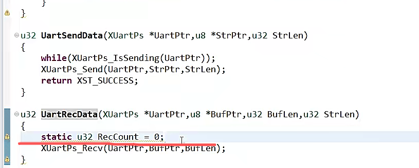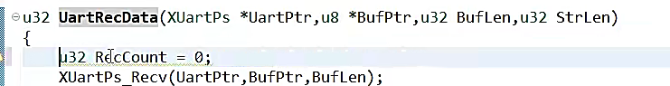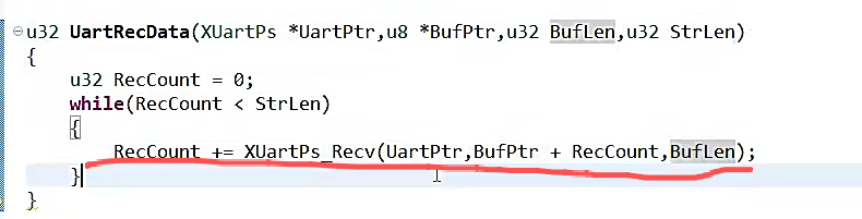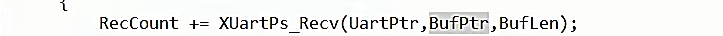 {u32 RecCount = 0;while(RecCount < StrLen){RecCount += XUartPs_Recv(UartPtr,BufPtr + RecCount,BufLen);}return XST_SUCCESS;