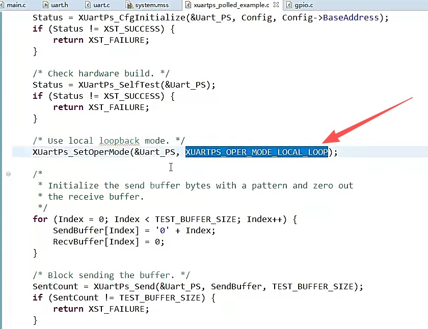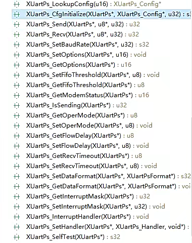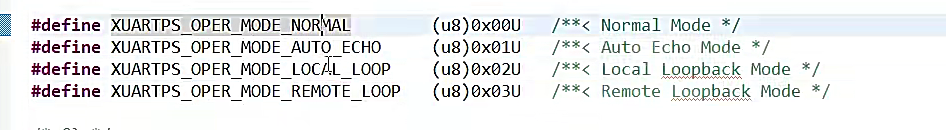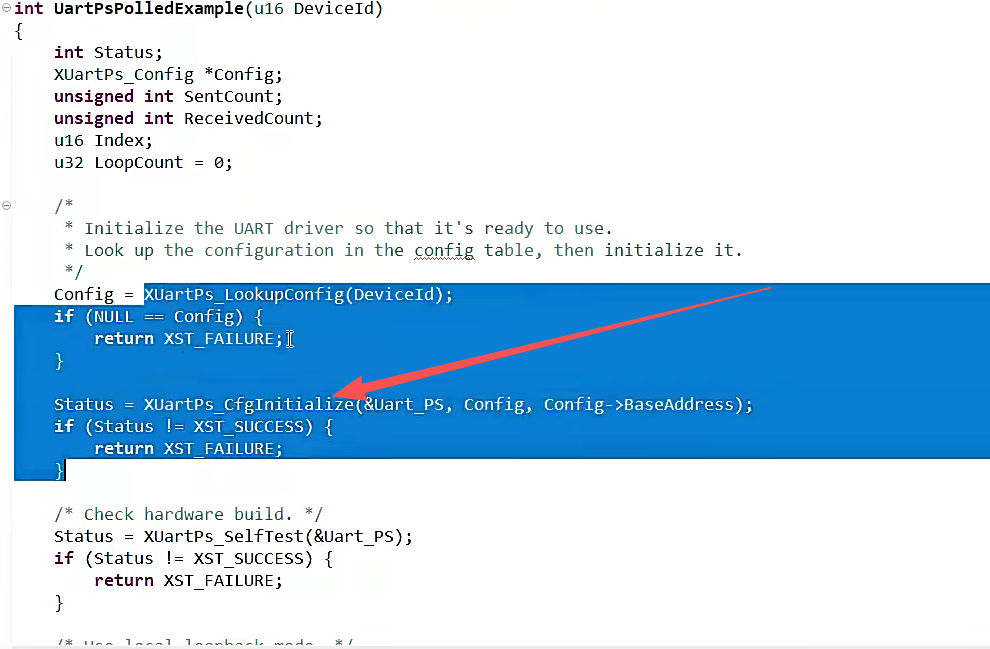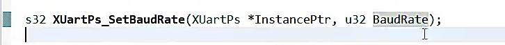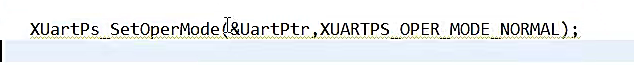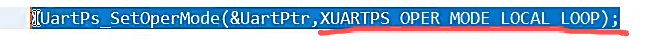 {int Status;XUartPs_Config *Config;Config = XUartPs_LookupConfig(DeviceId);if (NULL == Config) {return XST_FAILURE;}Status = XUartPs_CfgInitialize(UartPtr, Config, Config->BaseAddress);if (Status != XST_SUCCESS) {return XST_FAILURE;}XUartPs_SetBaudRate(UartPtr,BaudRate);if(LoopTure){XUartPs_SetOperMode(UartPtr,XUARTPS_OPER_MODE_LOCAL_LOOP);}else{XUartPs_SetOperMode(UartPtr,XUARTPS_OPER_MODE_NORMAL);}return XST_SUCCESS;