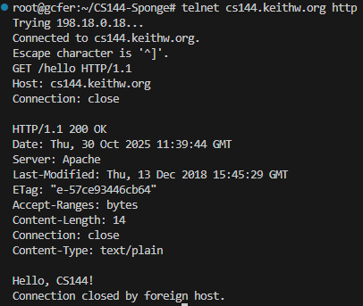 5.注意,这里还需要额外的打一个空行,表示HTTP请求服务结束。随后便可以收到对方发送收到请求的消息,并最终传回我们需要的资源,最终展示Hello CS144!的字样,如下图: